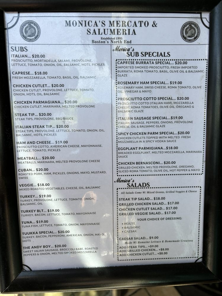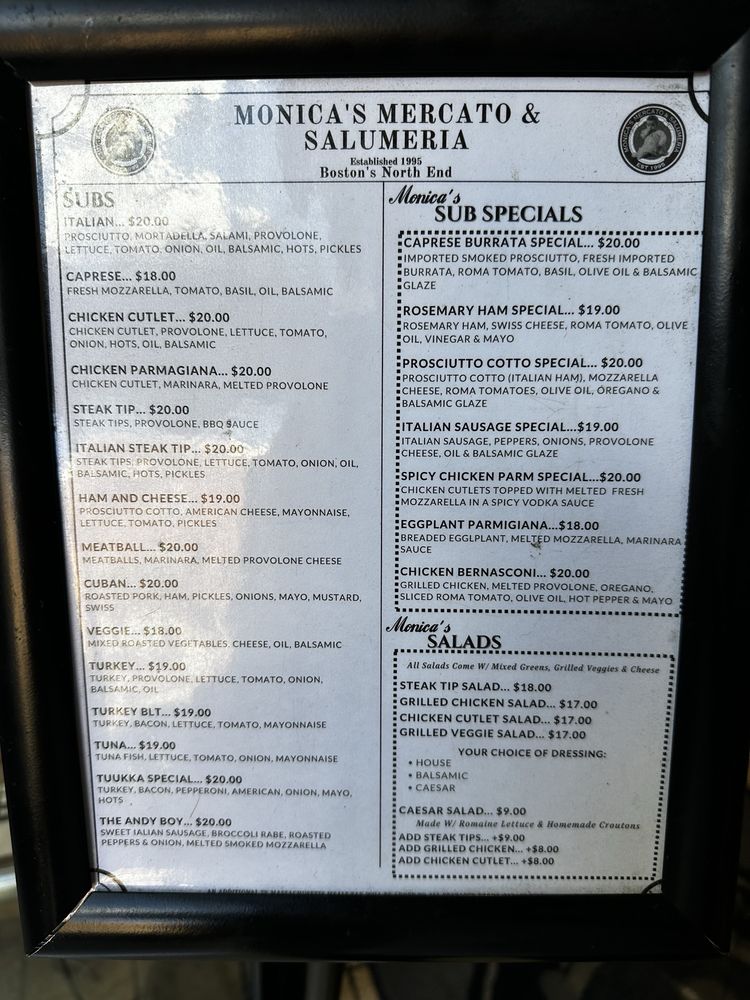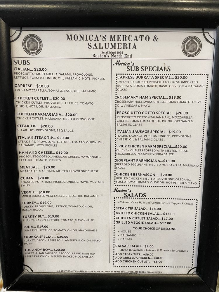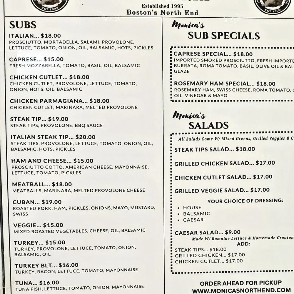 Monica's Mercato, located in Boston's North End, offers a delightful menu of salads, deli sandwiches, and hearty soups. The extensive range of subs includes favorites like the Italian Sub with Prosciutto, Mortadella, Salami, and more, as well as the flavorful Steak Tip Sub. Customers rave about the generous portions and fresh ingredients used in each dish. The Grilled Chicken Caesar Salad and Monica's World Famous Chicken Soup are also must-tries. With various amenities like outdoor seating, catering options, and Wi-Fi, Monica's Mercato provides a cozy dining experience with excellent service. Overall, this Latinx-owned establishment impresses with its authentic flavors, generous portions, and welcoming ambiance. Be sure to try the Italian sub for a truly memorable dining experience.