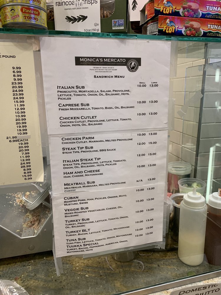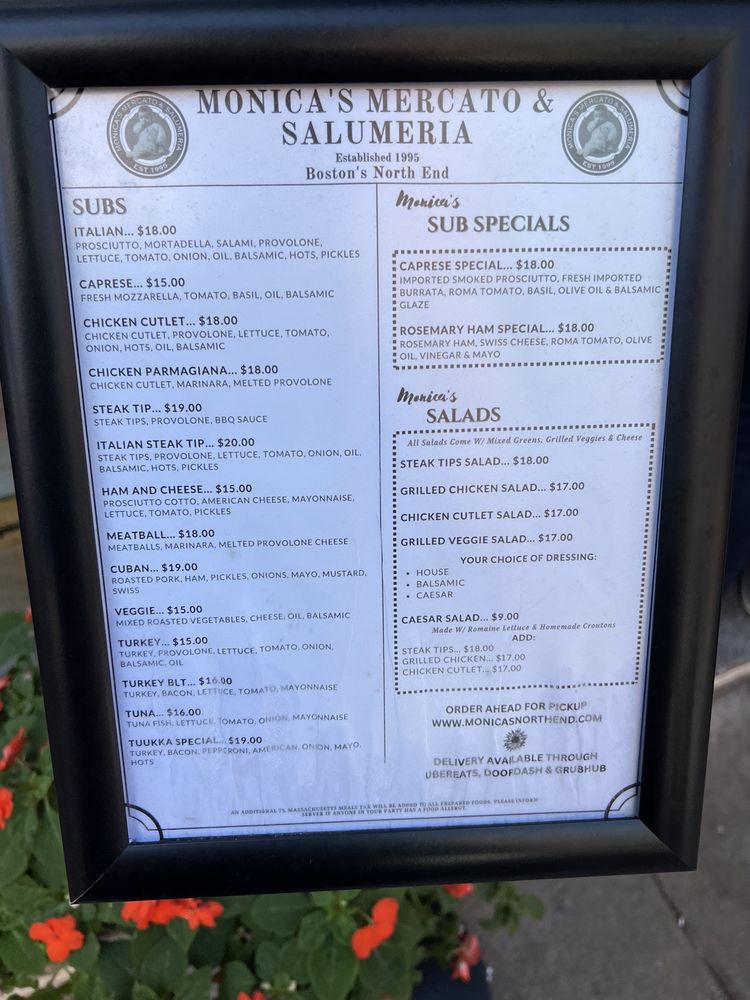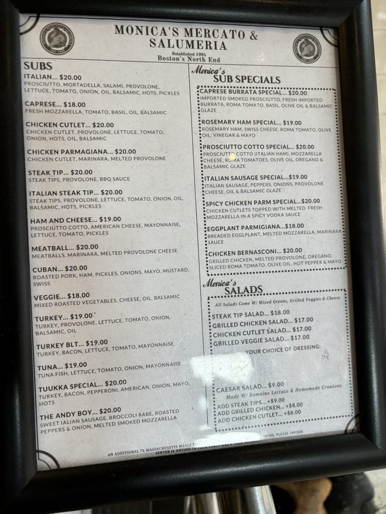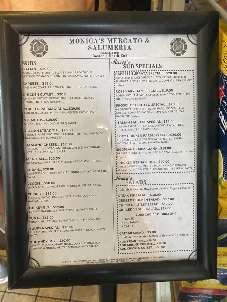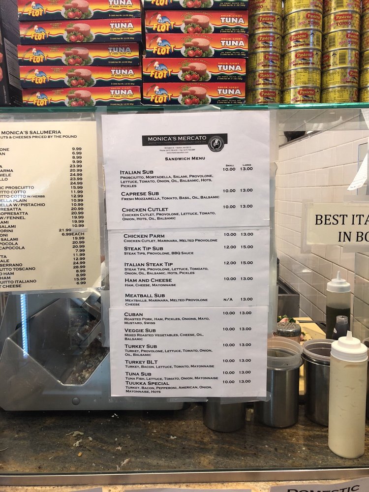 Monica's Mercato, located in Boston's North End, offers a delightful menu of salads, deli sandwiches, and hearty soups. The extensive range of subs includes favorites like the Italian Sub with Prosciutto, Mortadella, Salami, and more, as well as the flavorful Steak Tip Sub. Customers rave about the generous portions and fresh ingredients used in each dish. The Grilled Chicken Caesar Salad and Monica's World Famous Chicken Soup are also must-tries. With various amenities like outdoor seating, catering options, and Wi-Fi, Monica's Mercato provides a cozy dining experience with excellent service. Overall, this Latinx-owned establishment impresses with its authentic flavors, generous portions, and welcoming ambiance. Be sure to try the Italian sub for a truly memorable dining experience.